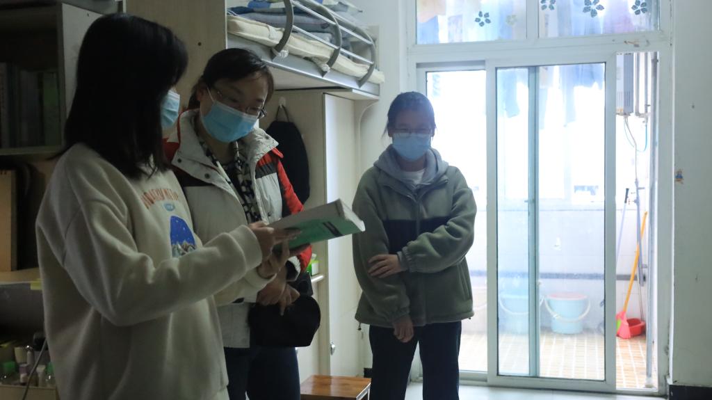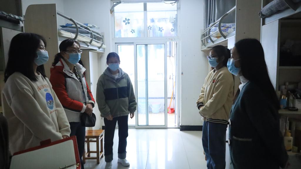 代远红走进学生寝室与同学们亲切交流,嘘寒问暖,详细了解同学们在疫情防控期间线上学习、生活、饮食、就业、心理等情况,认真听取同学们的意见诉求,帮助解决问题。她与同学们交流疫情防控期间如何处理好日常学习与考研就业、身心健康的关系,叮嘱同学们要认真对待线上教学,加强自我学习,遇到问题及时与任课教师沟通,保障学习效果;要及时增添衣服注意保暖,适当运动锻炼,提高身体免疫力;要做好个人防护、宿舍通风、健康监测、核酸检测及用电安全,保持安全距离,不扎堆、不聚集,团结一心共克时艰,共守和谐平安校园。叮嘱二级学院要将力量下沉到学生寝室,特别关注有困难的学生,及时帮助解决生活学习之需。